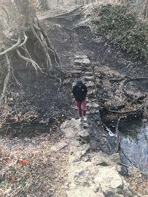We went for a chilly hike recently at one of my favorite places, Cave Springs. Cave Springs is both sketchy and magical. It's very urban - sadly there's always a bit of trash here and there and traffic can be heard no matter where you are during the hike. But I'm very drawn to this place and like to visit at least once each season. I must add that, even though there' s a bit of trash, it could be so much worse. I think there must be a group of individuals who regularly take care of the place.